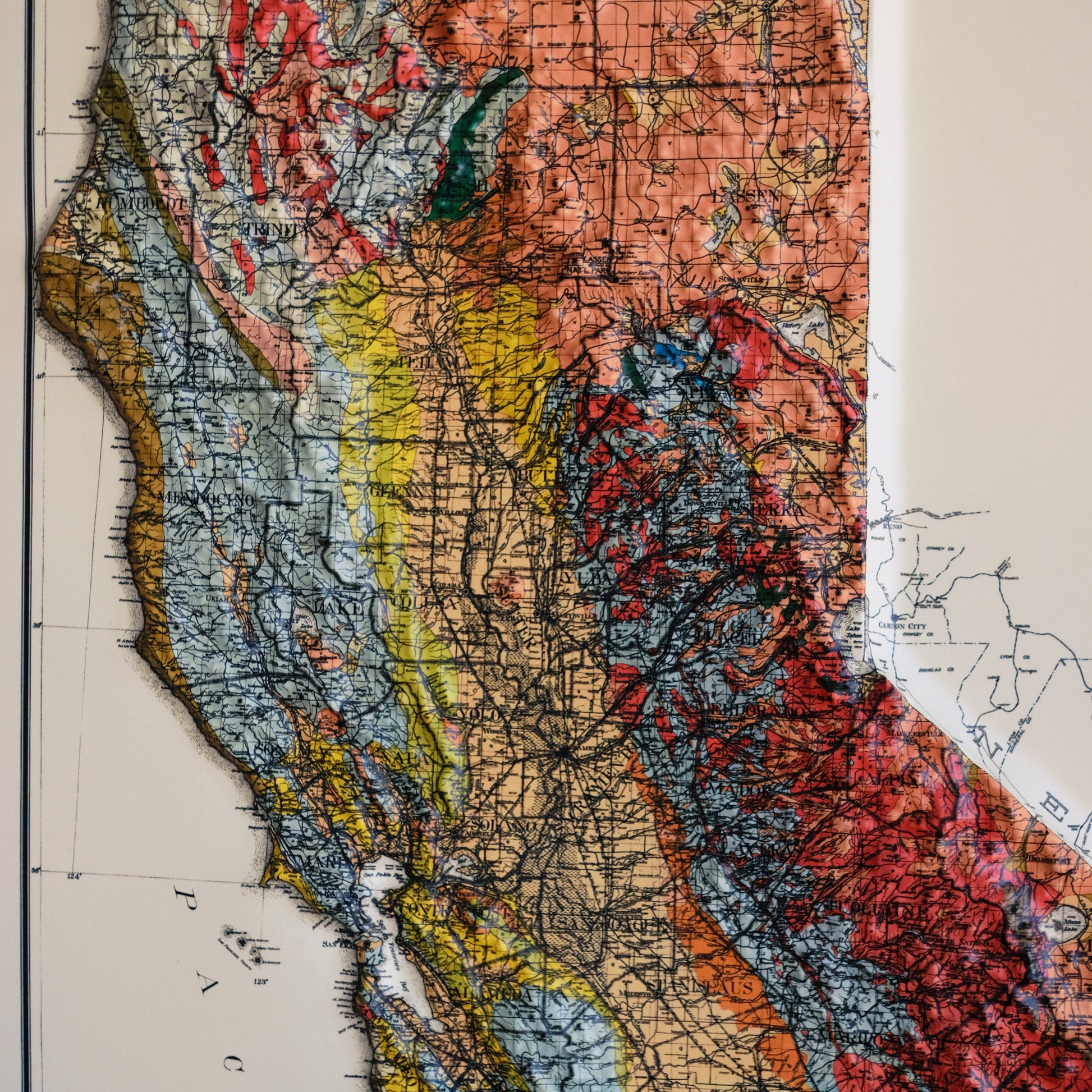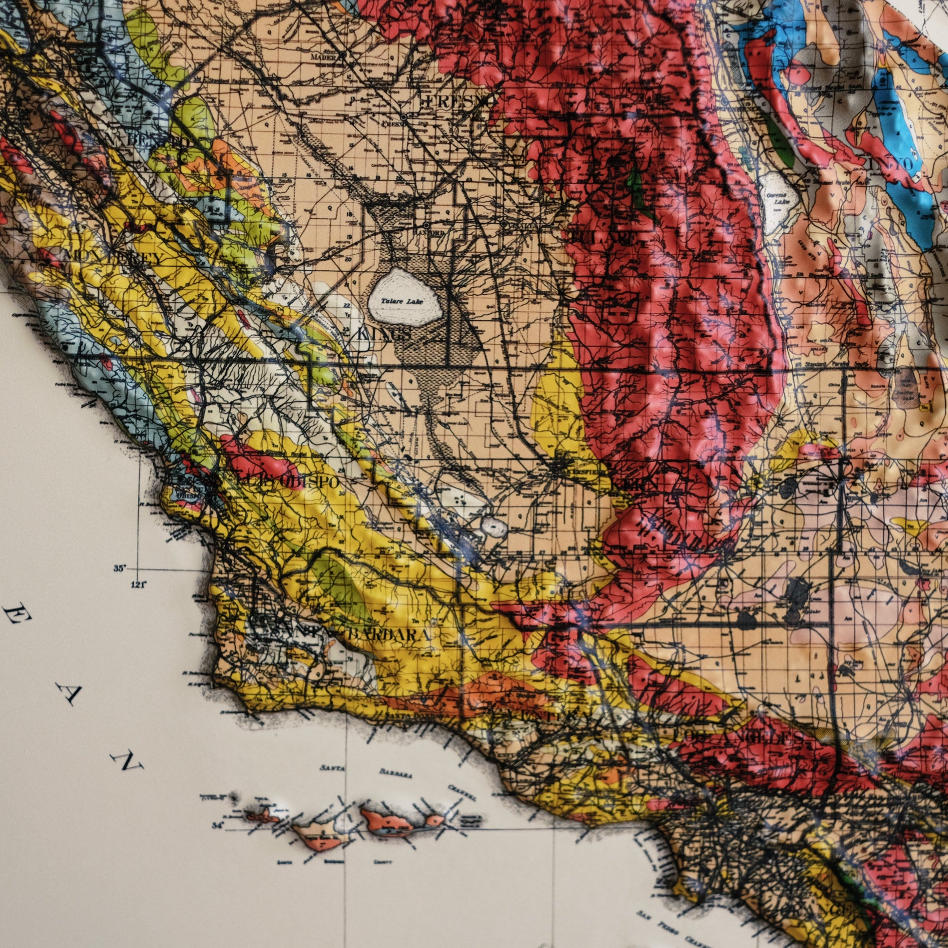 Explore the topography of California 1916 Geological Map of the state in stunning 3D Raised Relief, an original creation from Muir Way. This unique map undergoes a meticulous process where it is printed, heated, and vacuum-formed over an intricately detailed 3D mold. The result is a map that allows you to visually and tactilely explore the diverse terrain of the state, from the Sierra Mountains to the Channel Islands.
