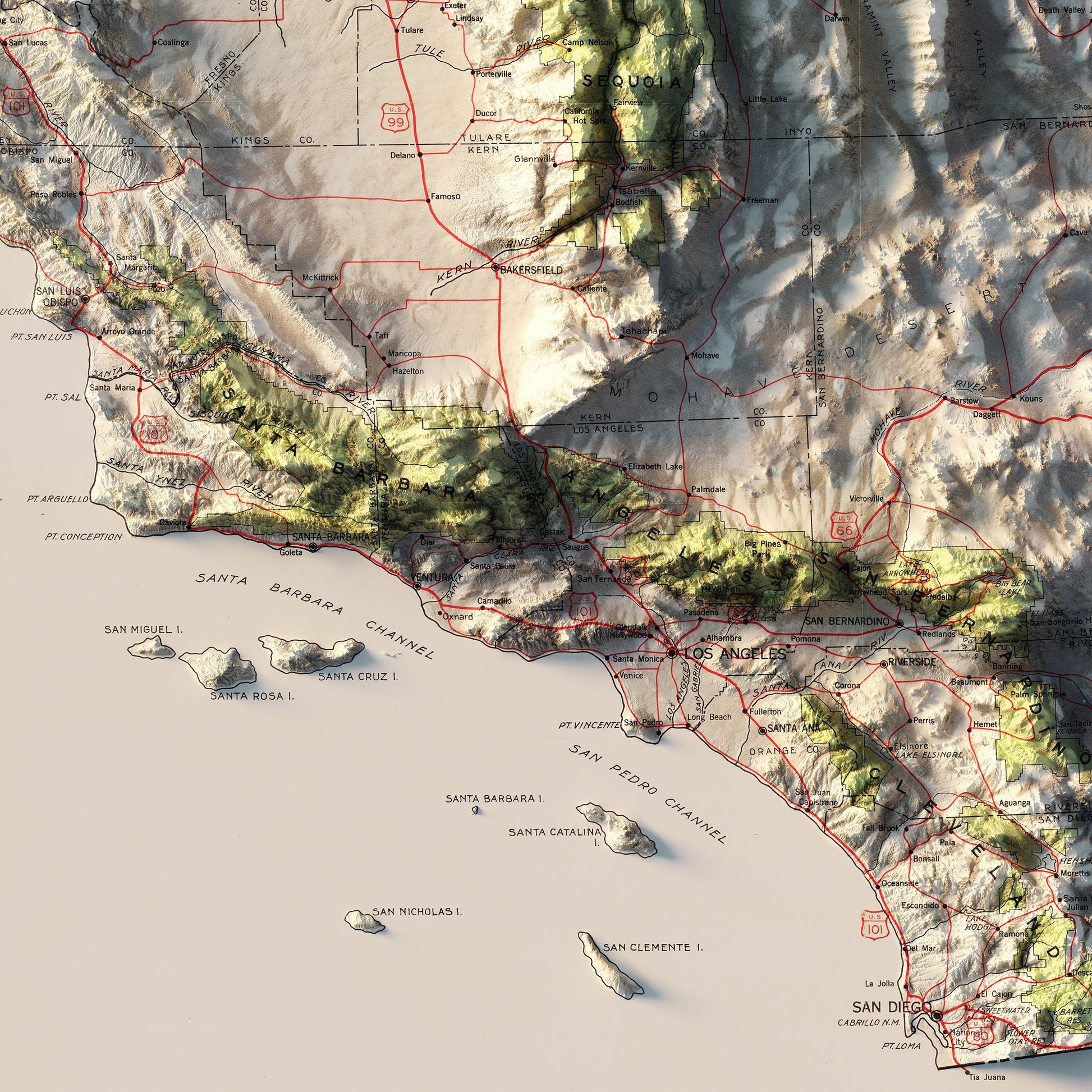 We created this map with the illusion of 3D by applying Digital Elevation Data and meticulously adding shaded relief to the landscape of the original 1931 National Forests of California map.