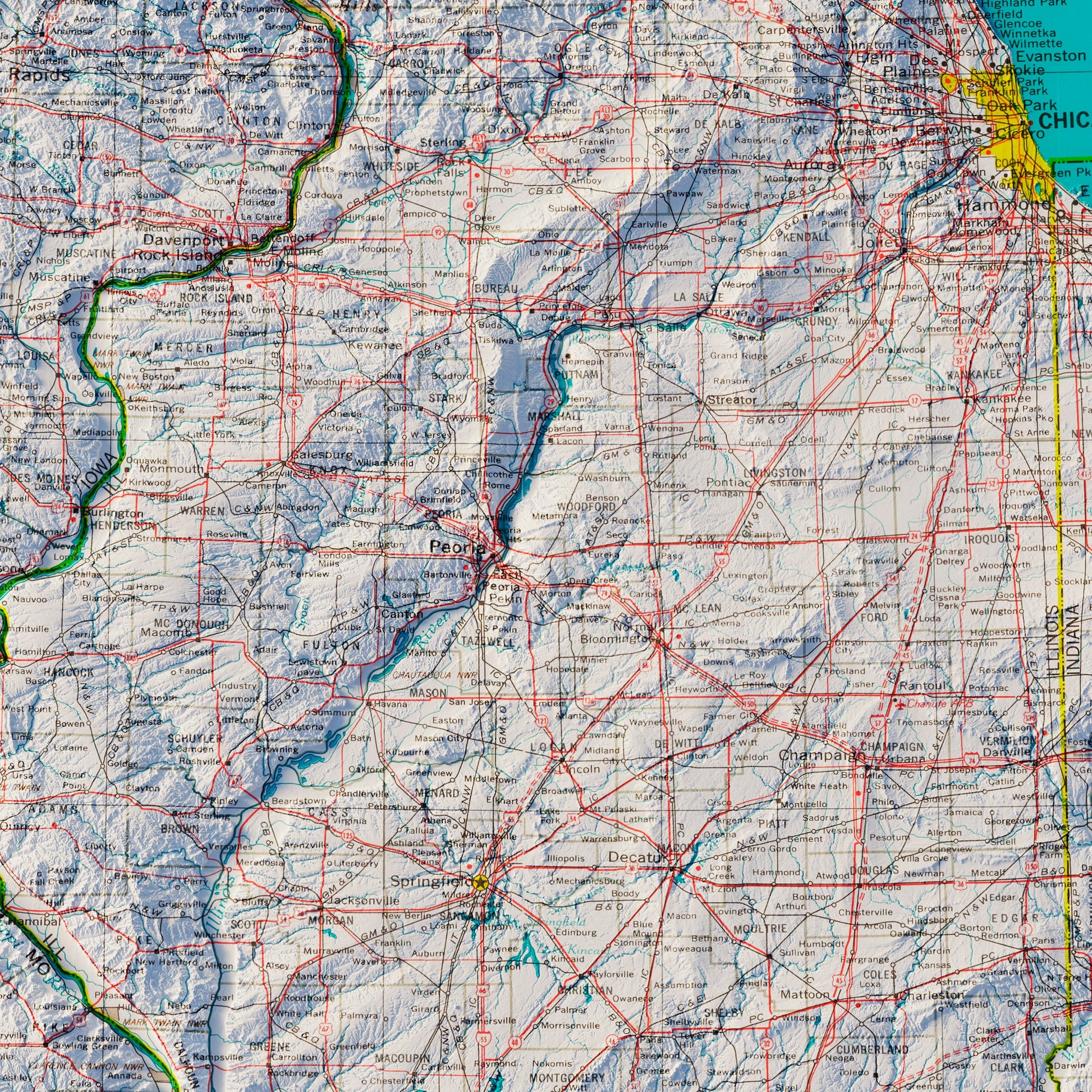 We created this map with the illusion of 3D by applying Digital Elevation Data and meticulously adding shaded relief to the landscape of the original. The map of the Central Plains States was first published as part of the 1970 United States National Atlas created by the USGS and includes political boundaries, cities, railways, roads, ferry lines, Indian reservations, national forests and parks, mountains, mesas, valleys, deserts, bodies of water, drainage, coastlines, and islands. The shading that we added is printed on the paper and is not a result of the map protruding from the surface.