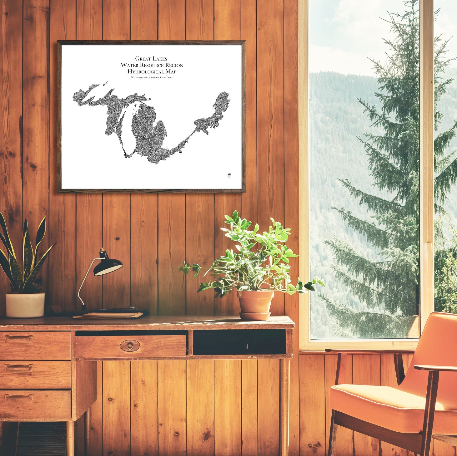 Water is literally the lifeblood of our country. If you’re drawn to water, you know that how and where it flows tells the story of a place. This map shows in fascinating detail how the rivers and streams of that discharge into the Great Lakes flow and interconnect, merge and diverge, carrying life to the land. The flow of water also has an inherent aesthetic elegance that our map captures beautifully.