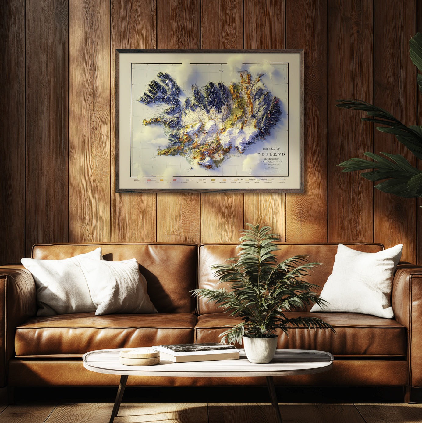 We created this map with the illusion of 3D by applying Digital Elevation Data and meticulously adding shaded relief to the landscape of the original 1901 Iceland Geological map. The shading is printed on the paper and not a result of the map protruding from the surface.