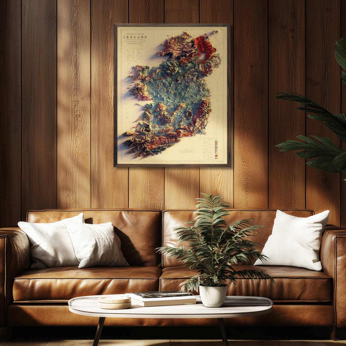 We created this map with the illusion of 3D by applying Digital Elevation Data and meticulously adding shaded relief to the landscape of the original 1878 Ireland Geological map. The shading is printed on the paper and not a result of the map protruding from the surface.