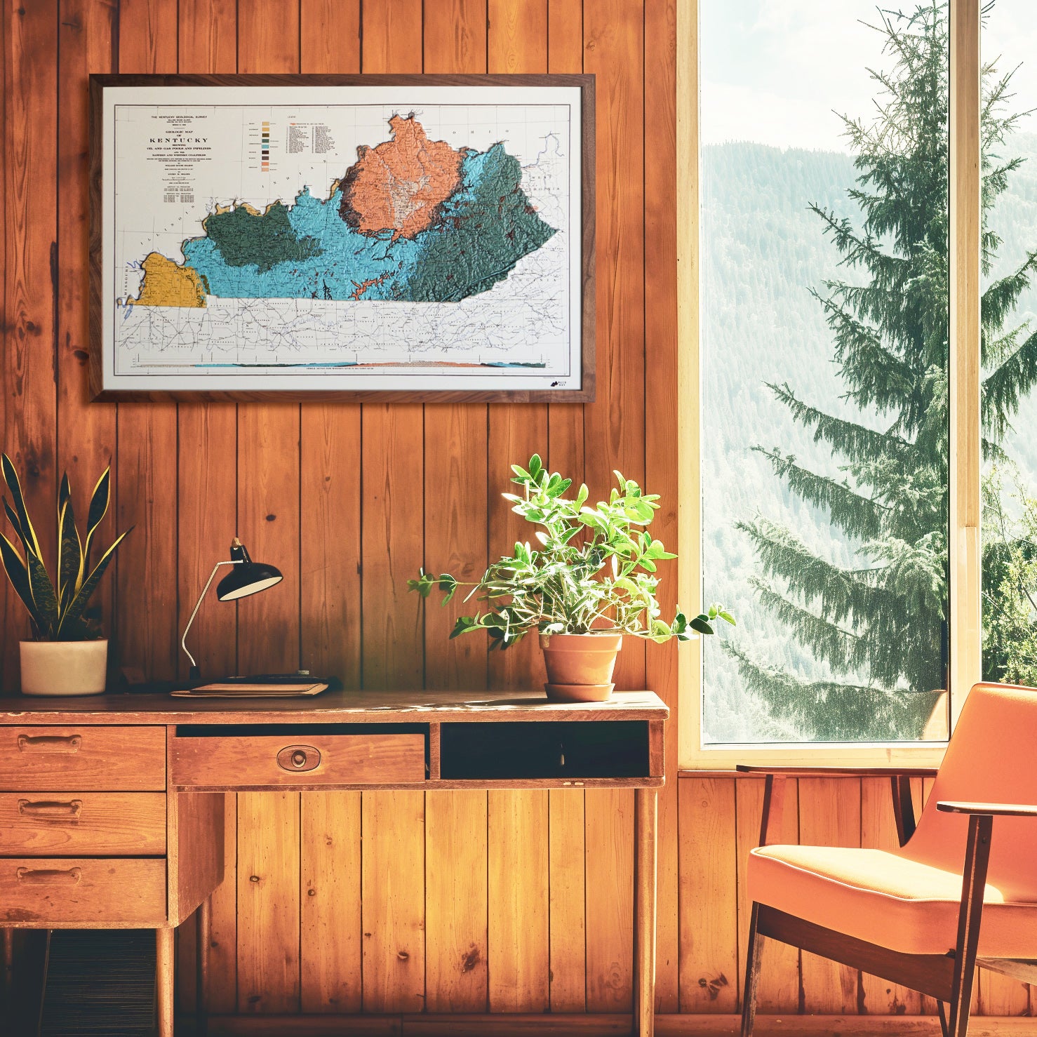 Explore the terrain of the "Bluegrass State" on the 1920 Geological Map of Kentucky in stunning 3D Raised Relief, an original creation from Muir Way. This unique map undergoes a meticulous process where it is printed, heated, and vacuum-formed over an intricately detailed 3D mold. The colors in the map represent the different geological formations underlying the state. The result is a map that allows you to visually and tactically explore the Kentucky's diverse terrain, from the Mississippi River to the Appalachian Mountains.