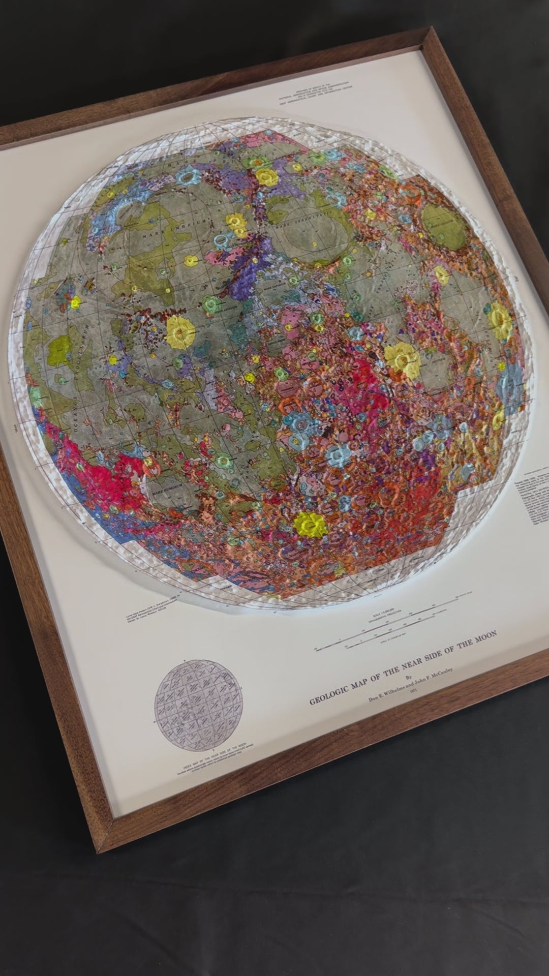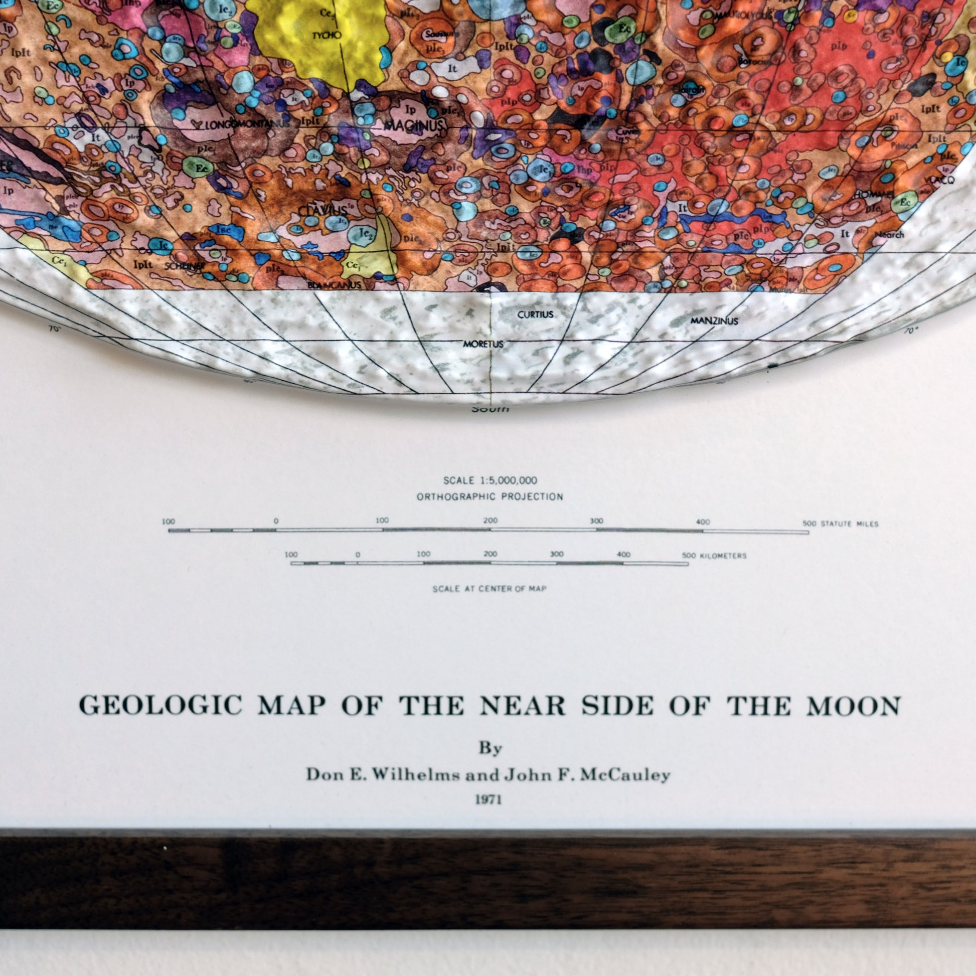 Our 3D Raised Relief Map of the Moon captivates with its geological details. The original map was based both on results of the telescopic mapping program and on data from the unmanned lunar exploration program, particularly the regional coverage of Lunar Orbiter IV. The color legend for the geological data is printed separately on flat paper and is included with this map.