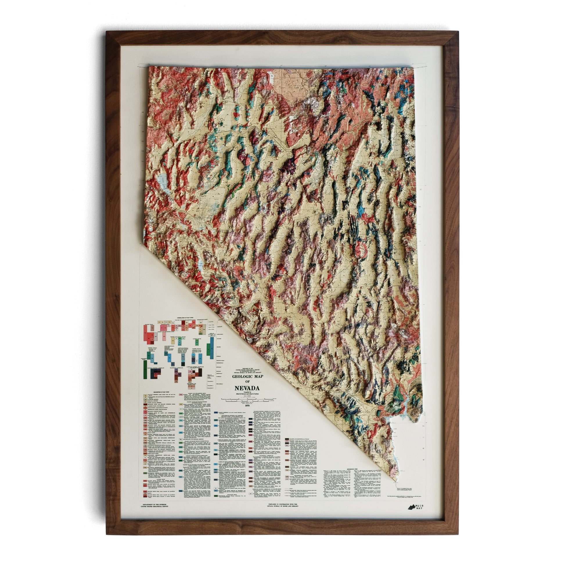 Explore the topography of the Nevada 1978 Geological Map of the state in stunning 3D Raised Relief, an original creation from Muir Way. This unique map undergoes a meticulous process where it is printed, heated, and vacuum-formed over an intricately detailed 3D mold. The result is a map that allows you to visually and tactically explore the diverse terrain of the state, from the Great Basin in the north to the Mojave Desert in the south.