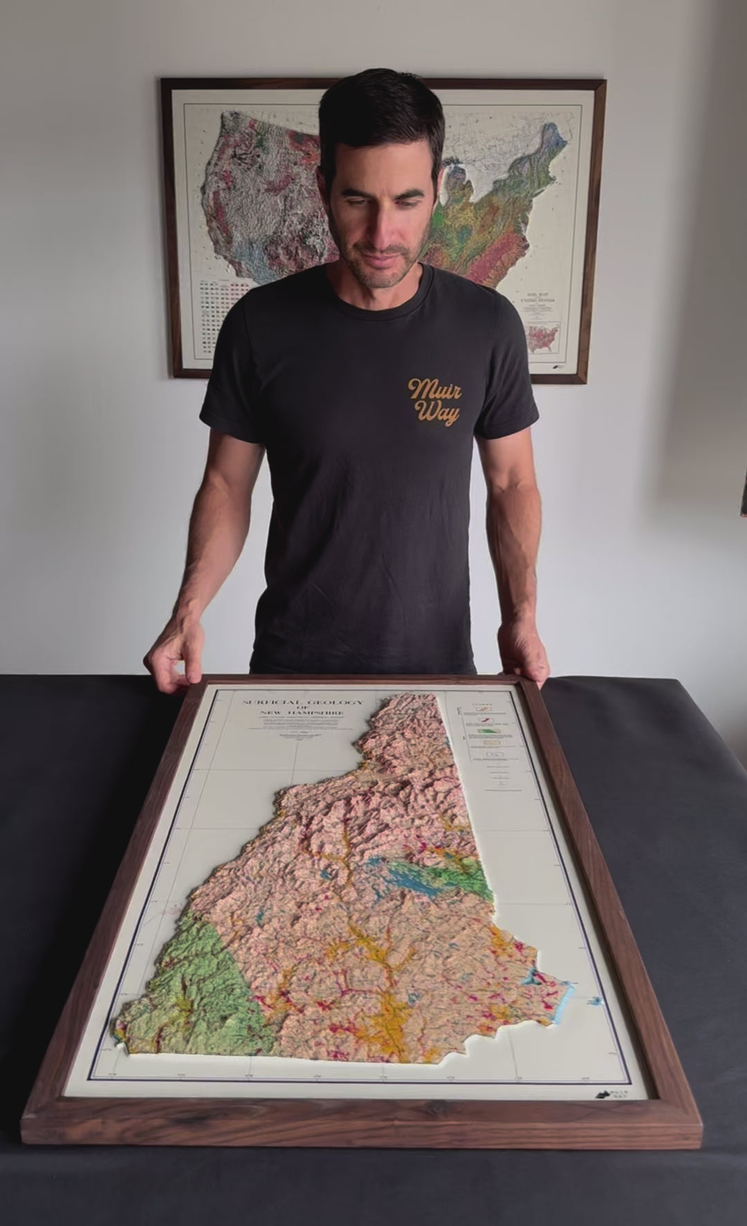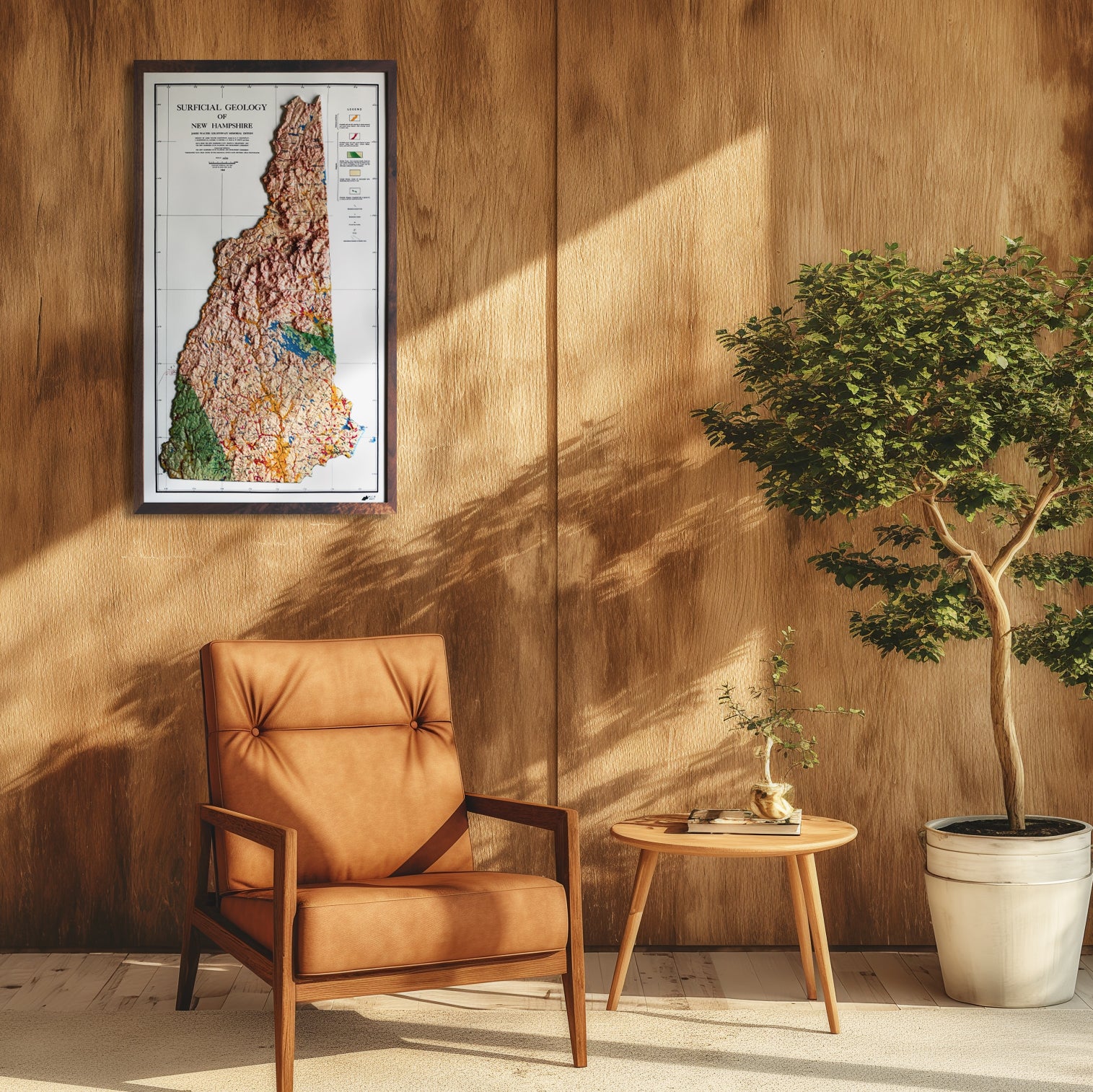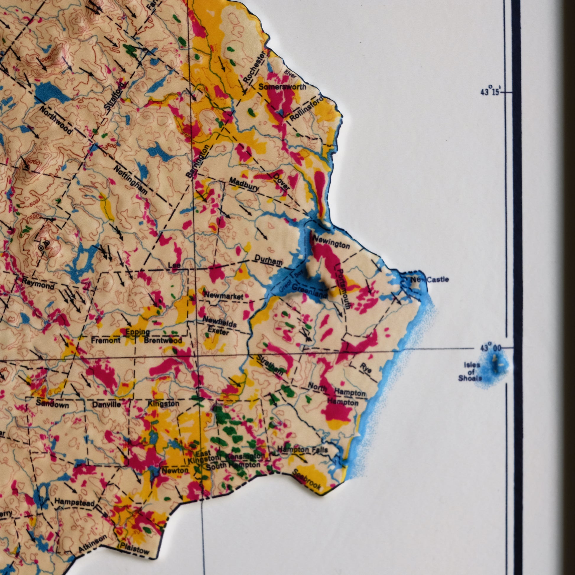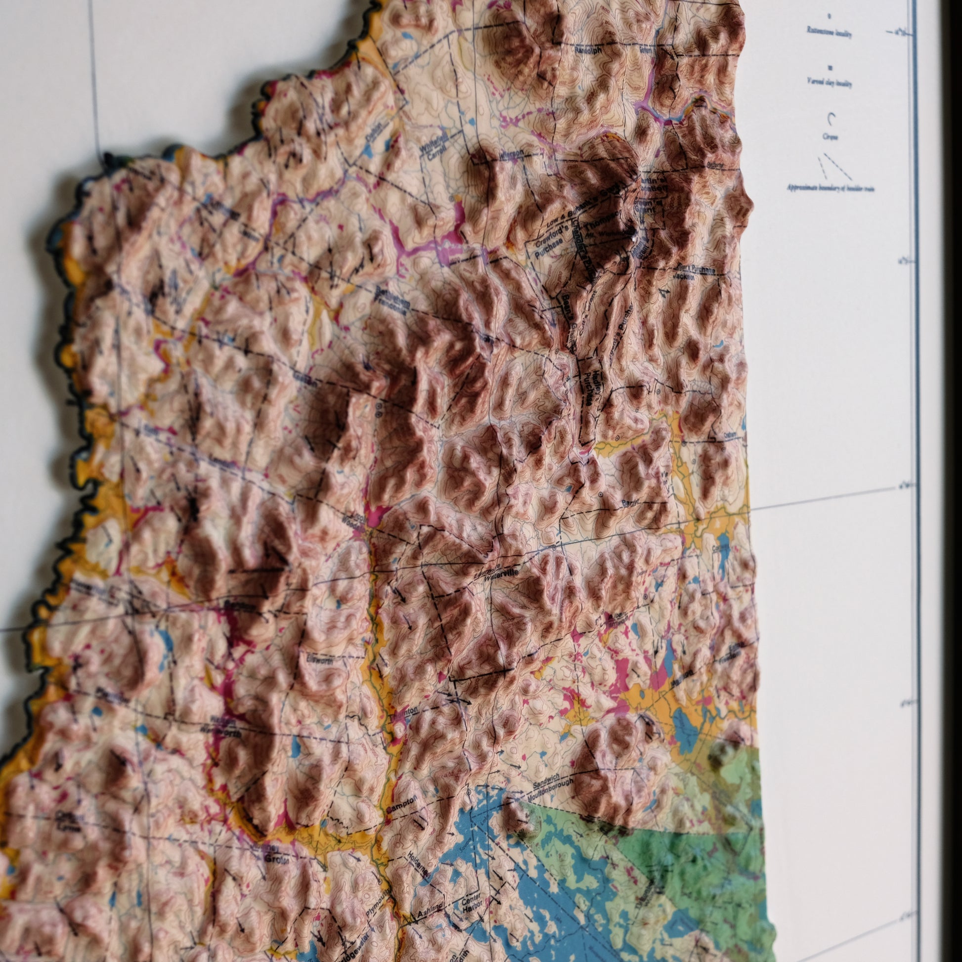 Explore the topography of New Hampshire in stunning 3D Raised Relief. We transformed this 1950 Geological map through a meticulous process where it is printed, heated, and vacuum-formed over an intricately detailed 3D mold. The result is a map that allows you to visually and tactically explore the diverse terrain of New Hampshire, from the White Mountains in the north to the coastal lowlands in the southeast.