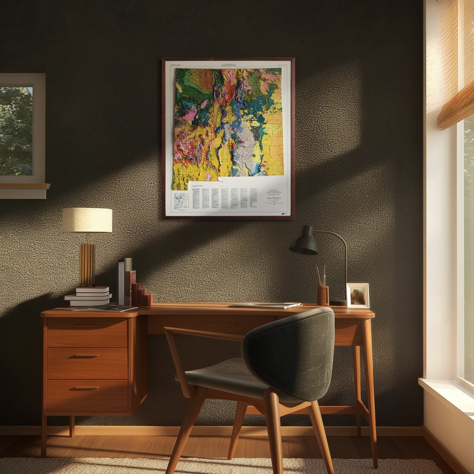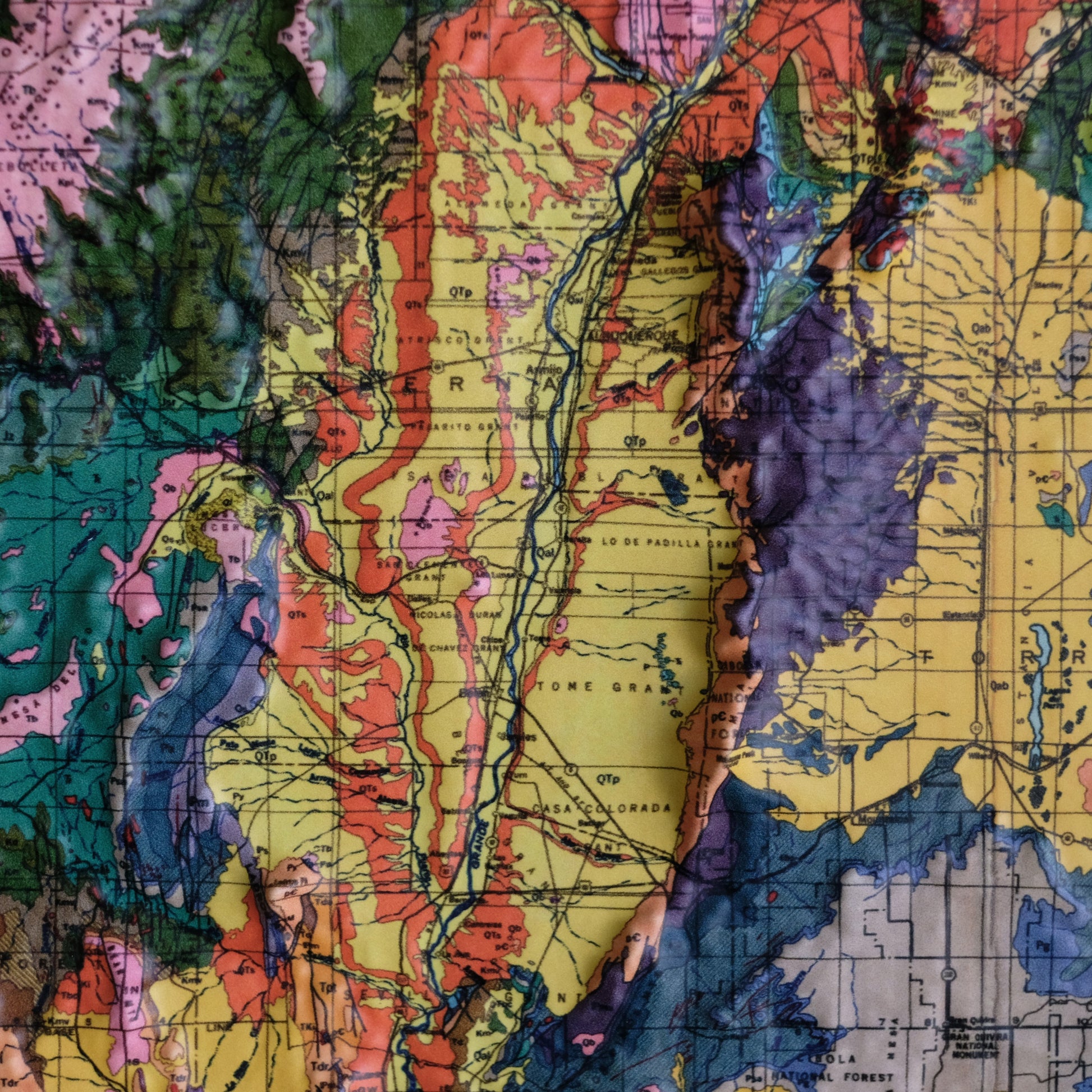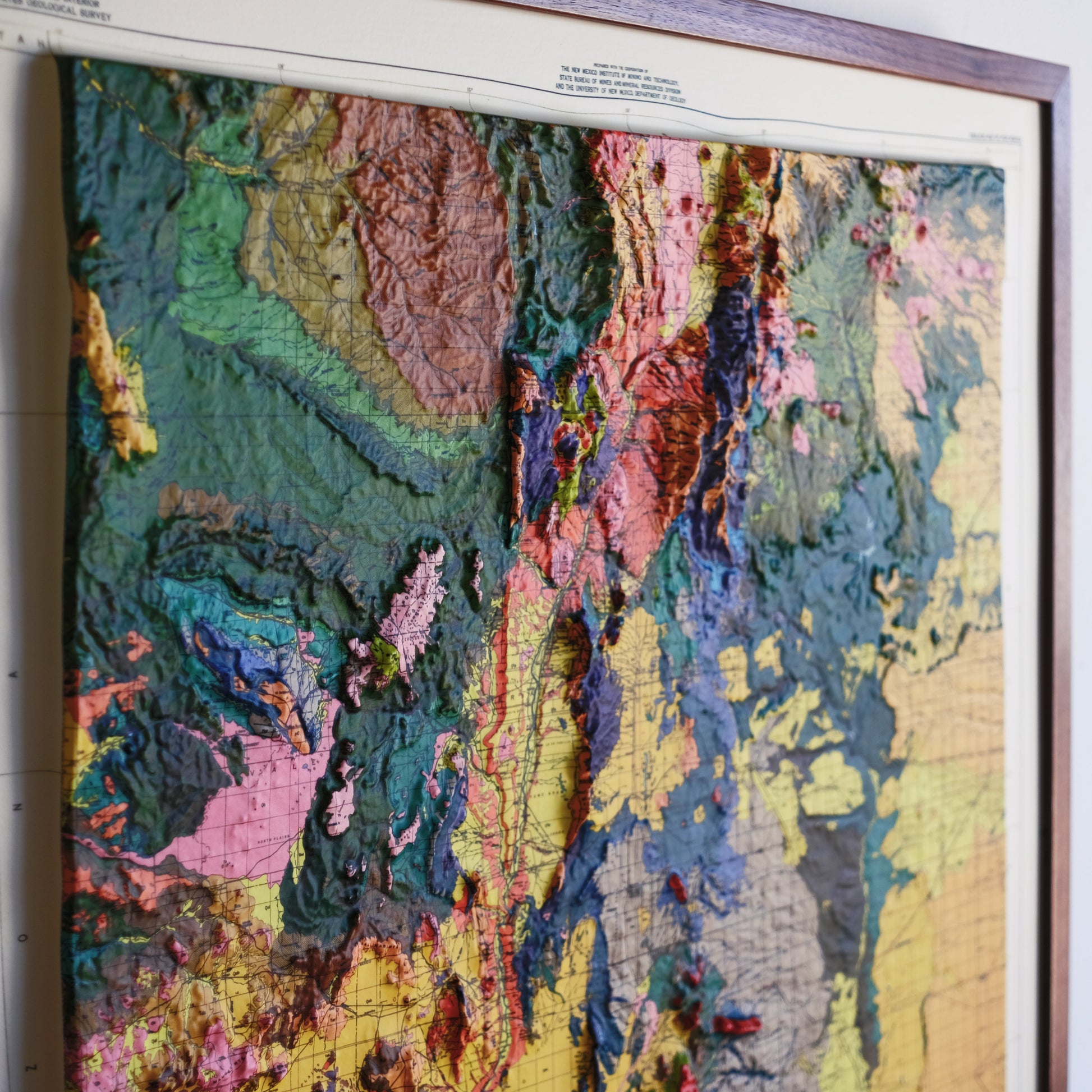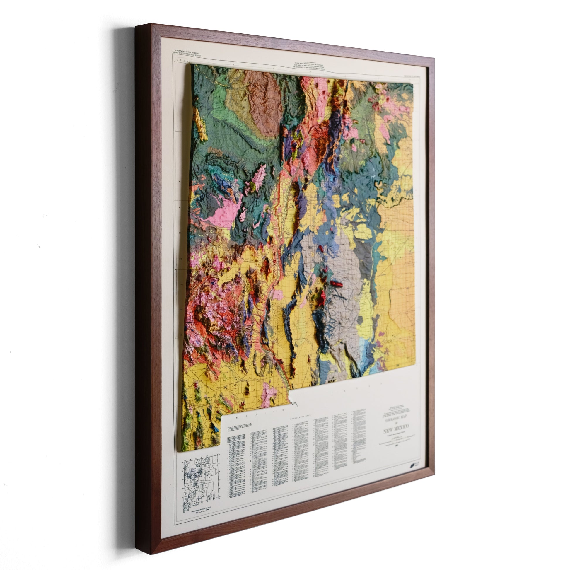 Explore the topography of New Mexico on the 1965 Geological Map of the state in stunning 3D Raised Relief, an original creation from Muir Way. This unique map undergoes a meticulous process where it is printed, heated, and vacuum-formed over an intricately detailed 3D mold. The result is a map that allows you to visually and tactilely explore the diverse terrain of the state, from the Sangre De Cristo Mountains to the Chihuahuan Desert.
