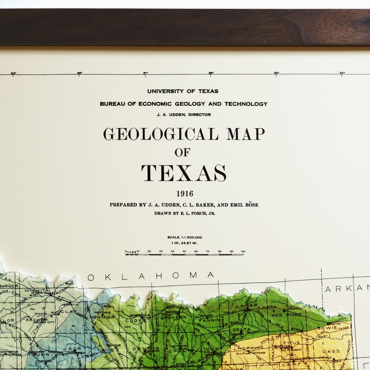 Explore the topography of Texas on the 1916 Geological Map of the state in stunning 3D Raised Relief, an original creation from Muir Way. This unique map undergoes a meticulous process where it is printed, heated, and vacuum-formed over an intricately detailed 3D mold. The result is a map that allows you to visually and tactilely explore the state's diverse terrain, from the Coastal Plains to Big Bend and Guadalupe Mountains.