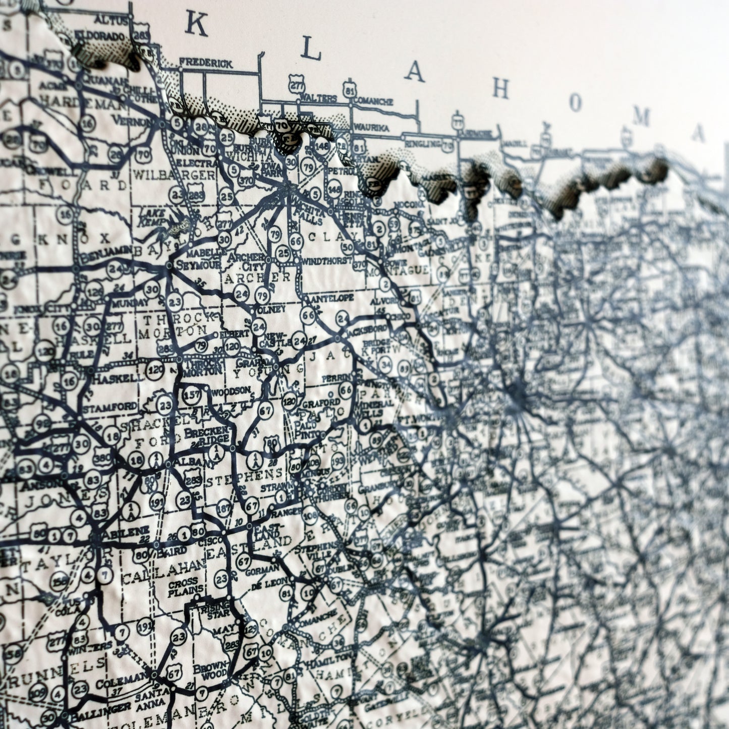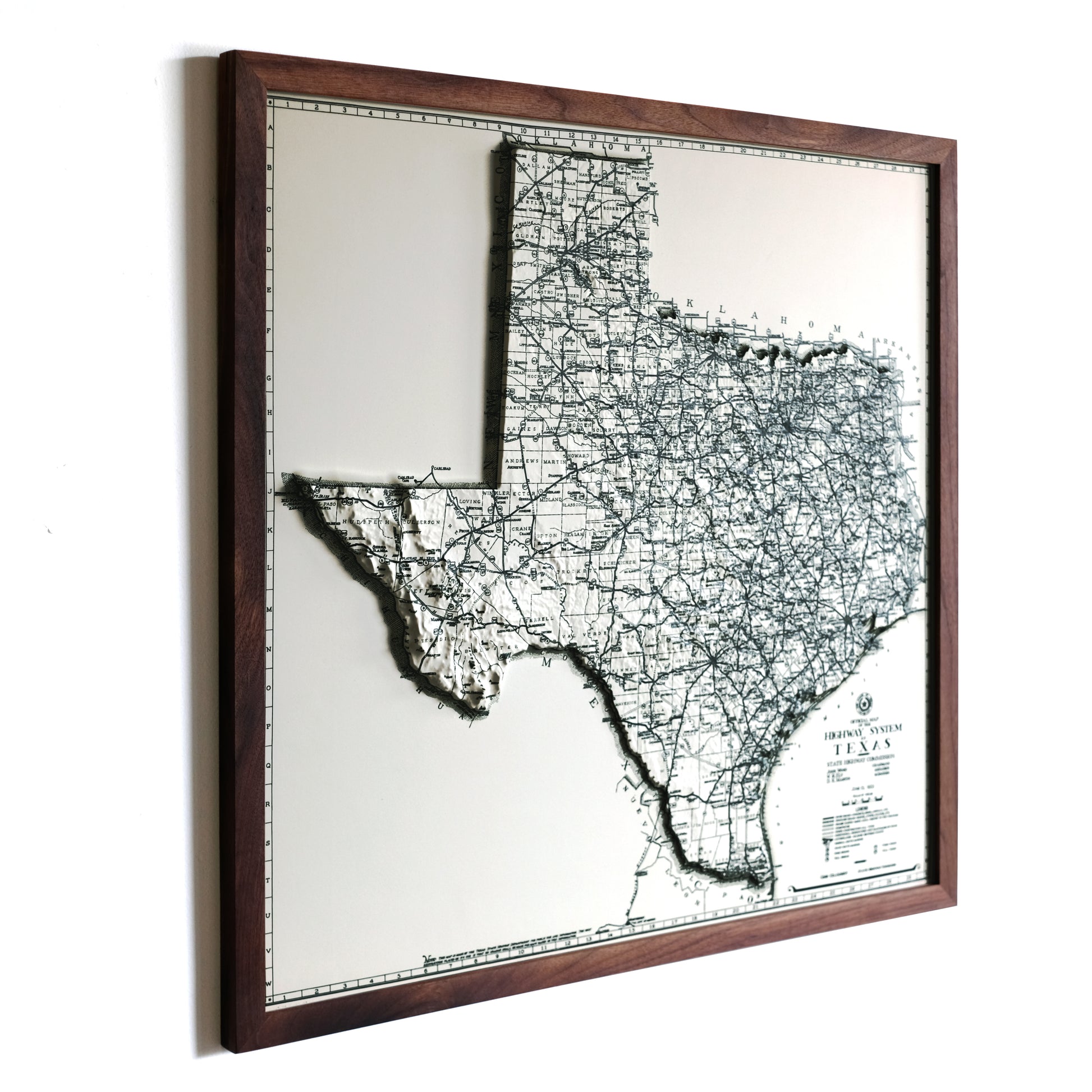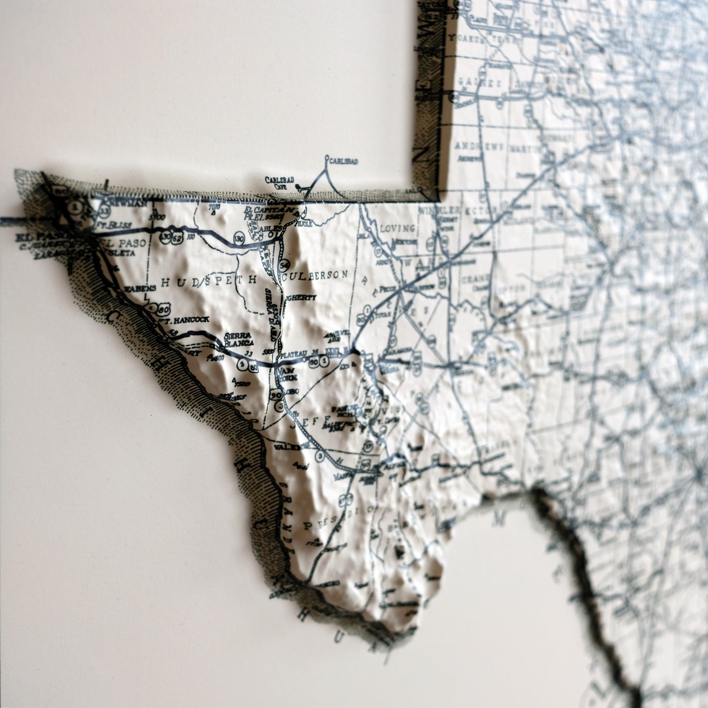 Explore the topography of Texas on the 1933 Highway System Map of the state in stunning 3D Raised Relief, an original creation from Muir Way. We created an intricately detailed 3D mold of the state to align with this map. The map then undergoes a meticulous process where it is printed, heated, and vacuum-formed over the mold forming a raised relief map. The result is a map that allows you to visually and tactilely explore the state's diverse terrain, from the Coastal Plains to Big Bend and Guadalupe Mountains.