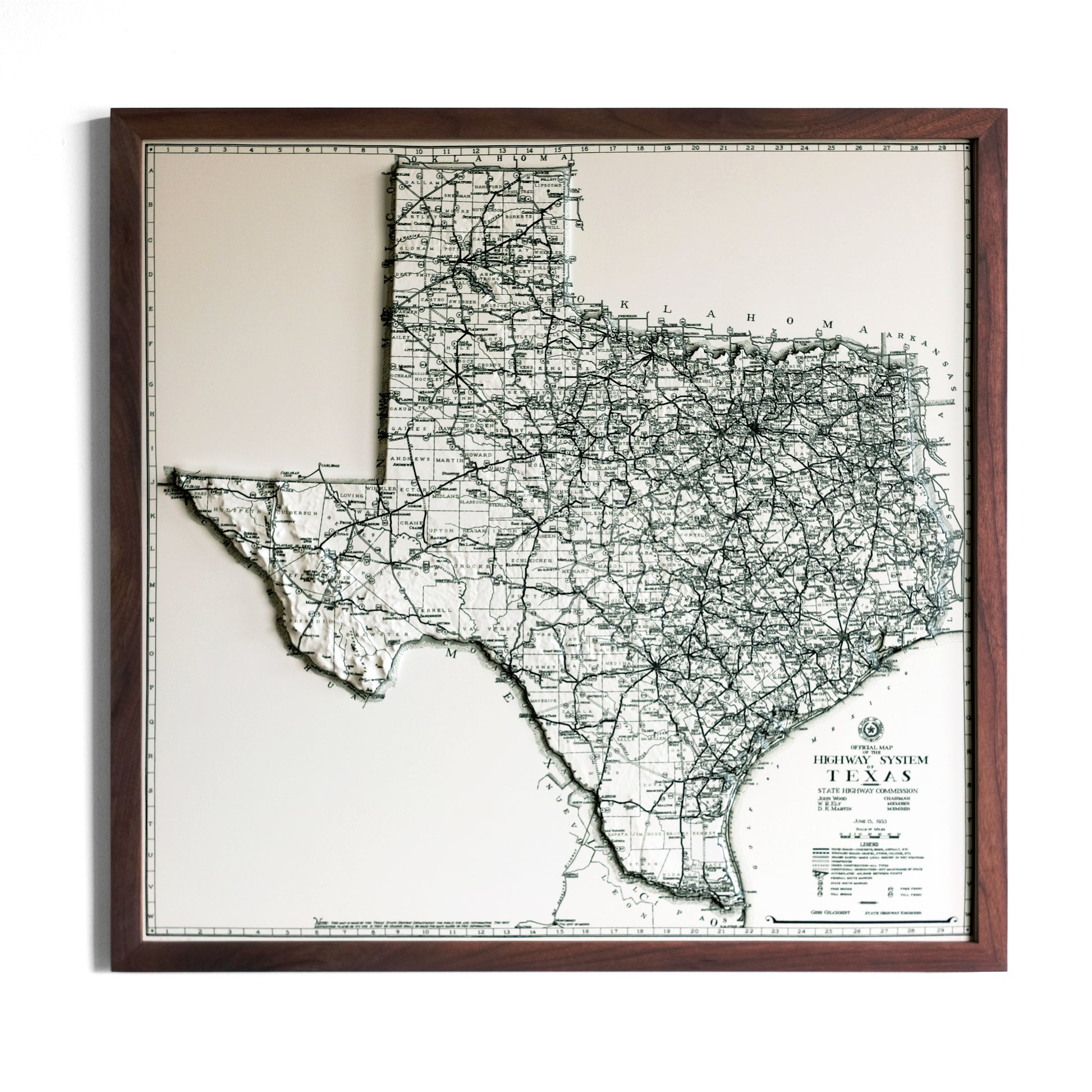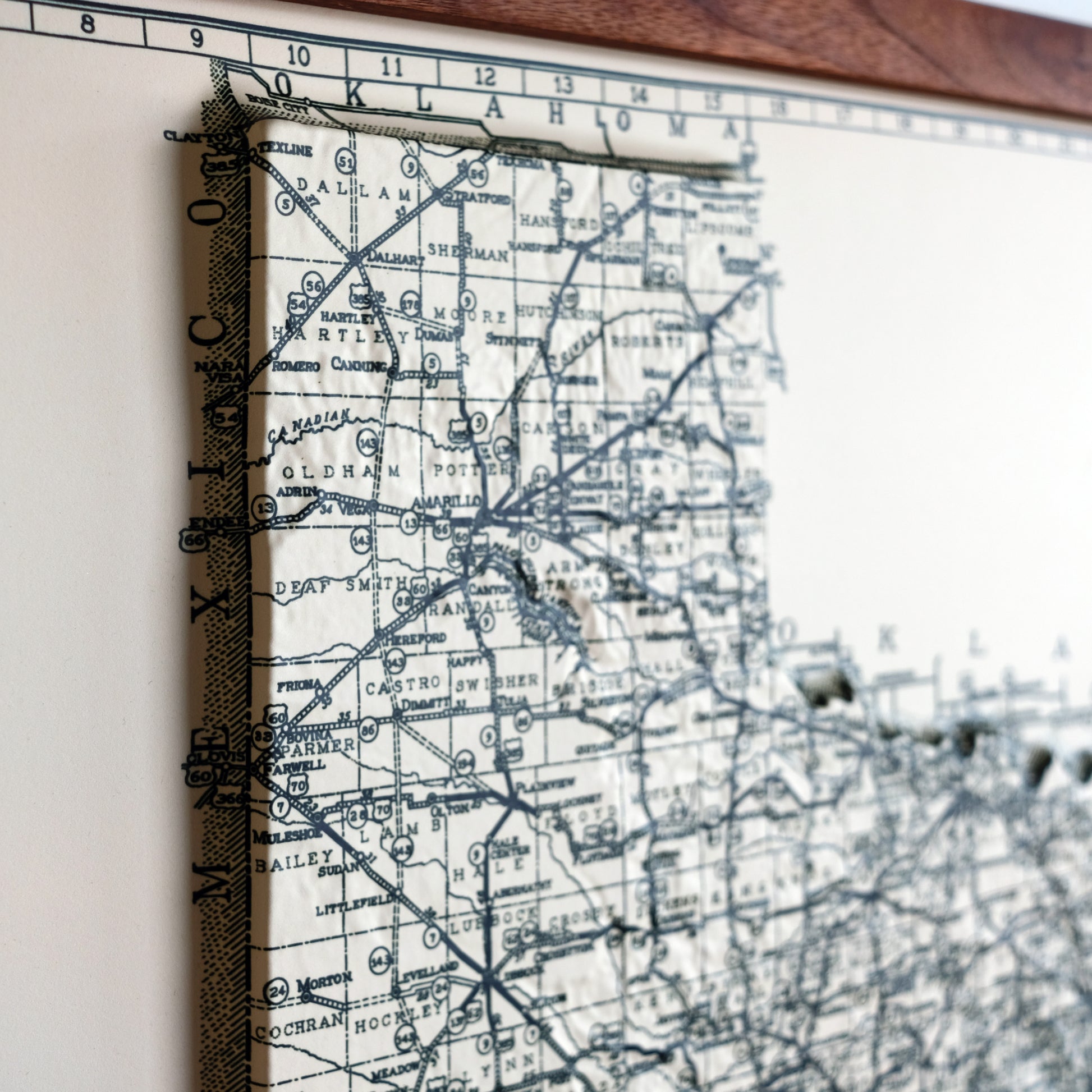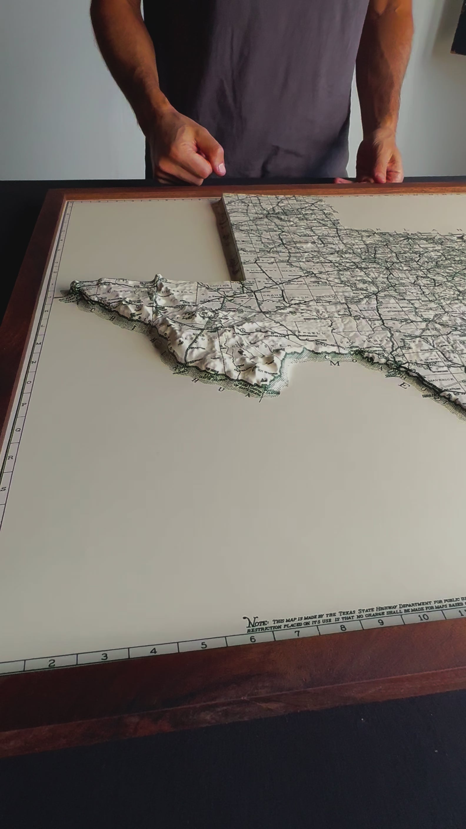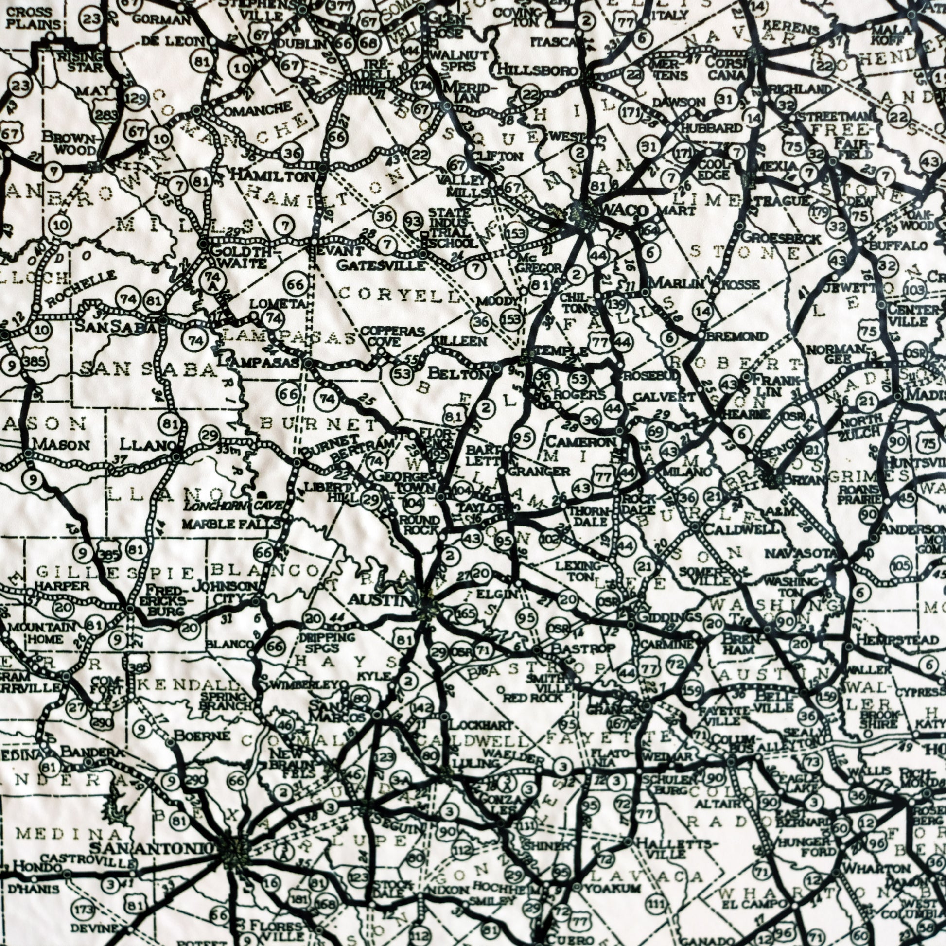 Explore the topography of Texas on the 1933 Highway System Map of the state in stunning 3D Raised Relief, an original creation from Muir Way. We created an intricately detailed 3D mold of the state to align with this map. The map then undergoes a meticulous process where it is printed, heated, and vacuum-formed over the mold forming a raised relief map. The result is a map that allows you to visually and tactilely explore the state's diverse terrain, from the Coastal Plains to Big Bend and Guadalupe Mountains.