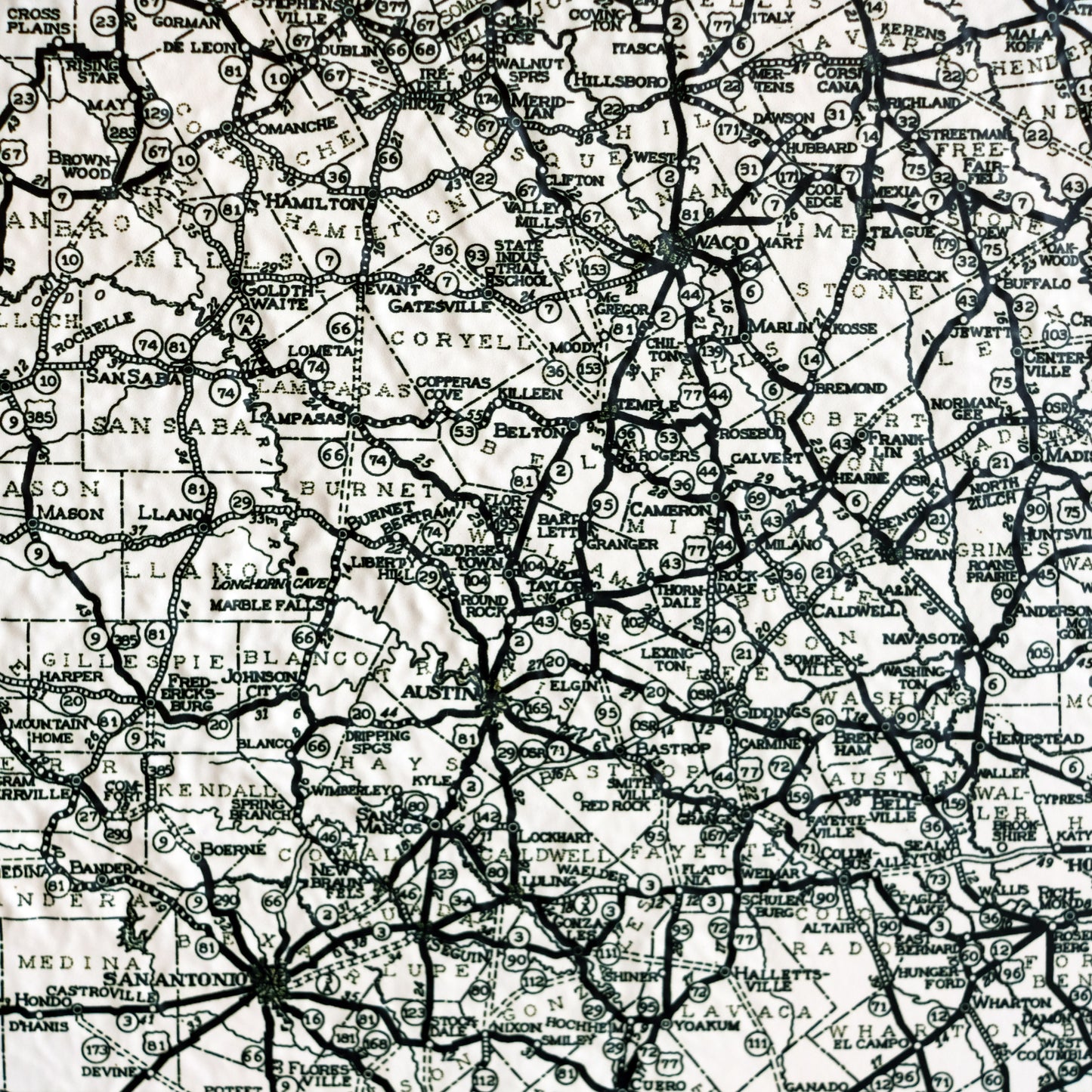 In addition to the raised terrain on this map, you will see the road system of Texas as it was in 1933 with all of the towns, cities, and counties labeled.