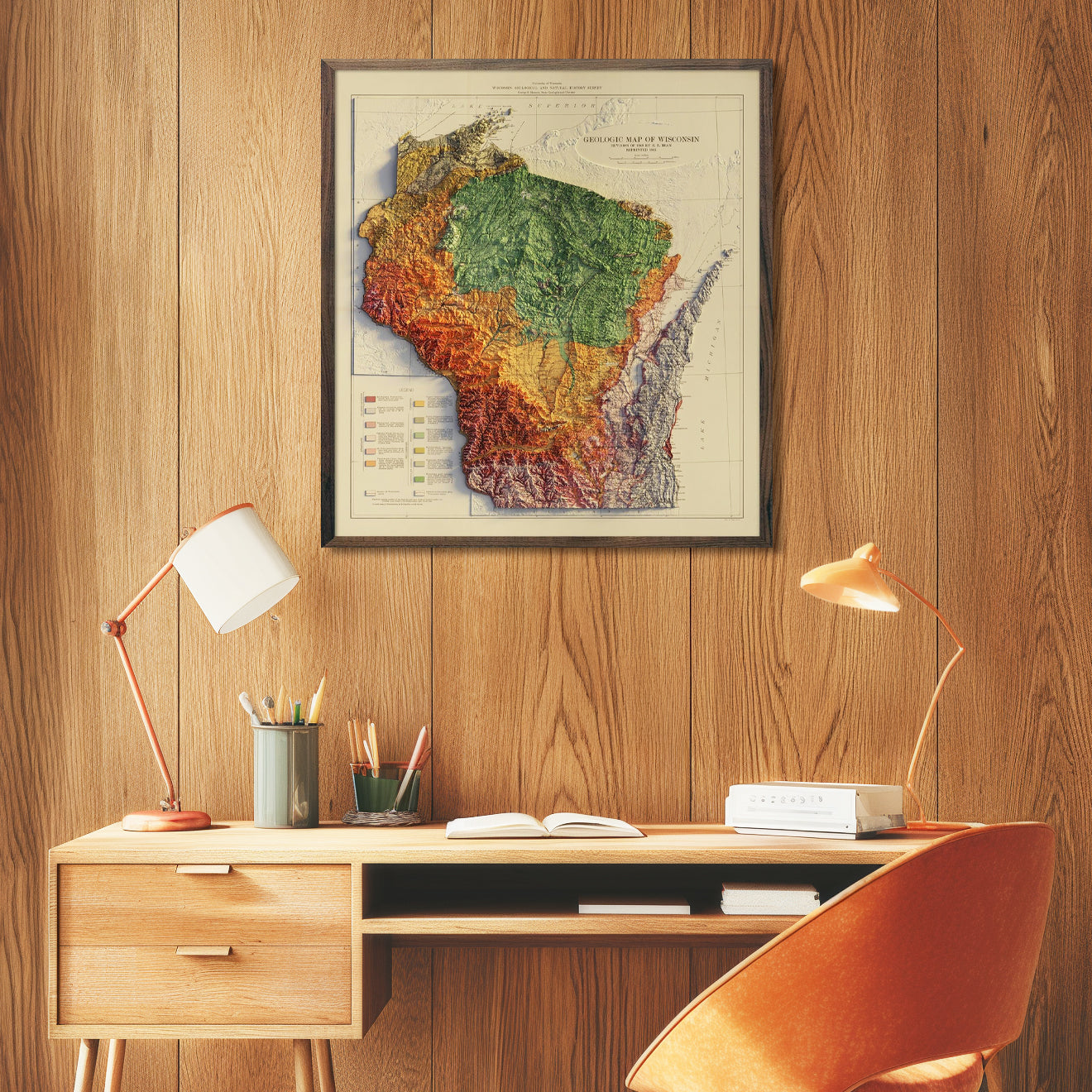 We created this map with the illusion of 3D by applying Digital Elevation Data and meticulously adding shaded relief to the landscape of the original 1965 Wisconsin Geological map. The shading is printed on the paper and not a result of the map protruding from the surface.