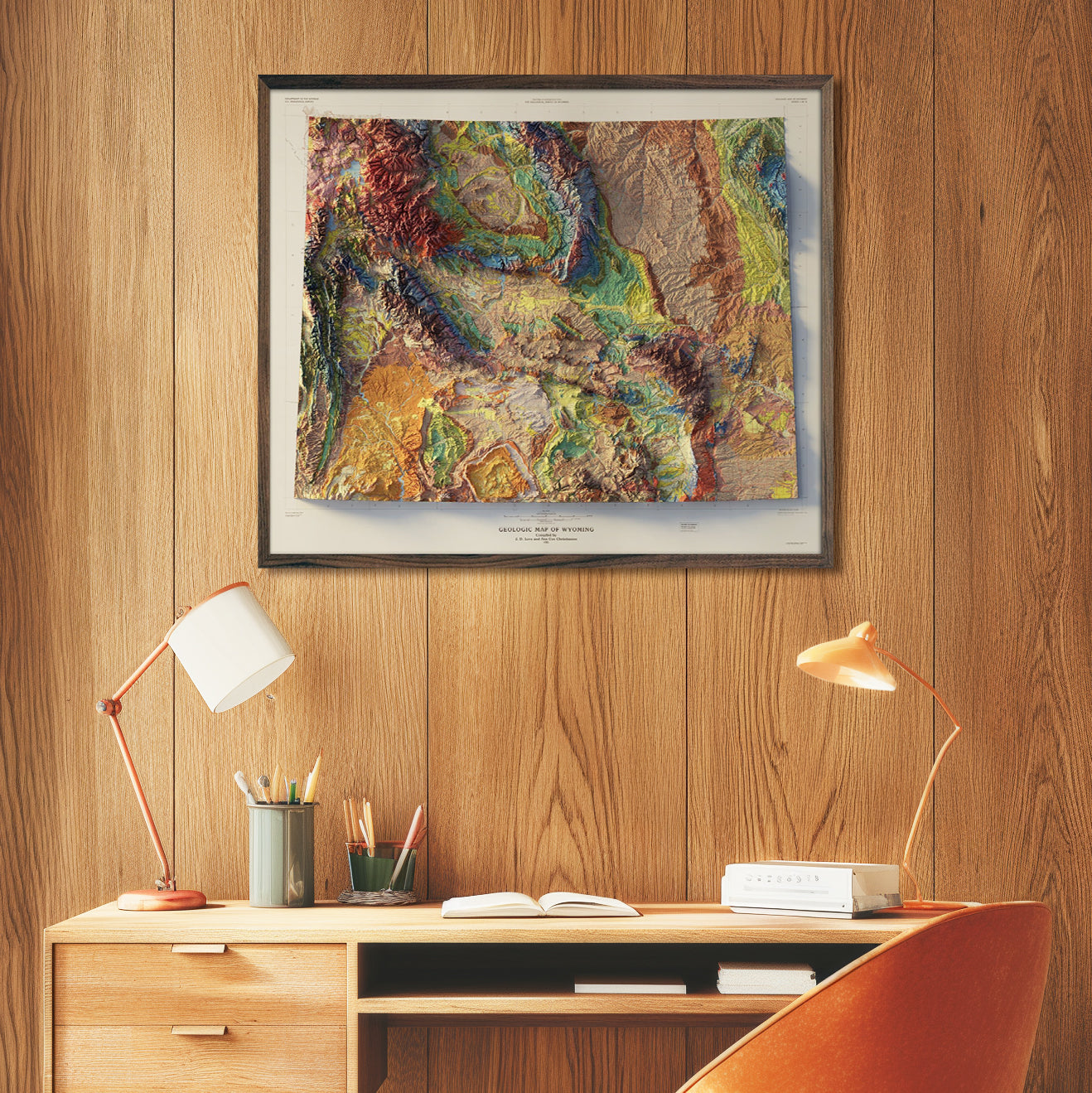 We created this map with the illusion of 3D by applying Digital Elevation Data and meticulously adding shaded relief to the landscape of the original 1985 Wyoming Geological map. The shading is printed on the paper and not a result of the map protruding from the surface.